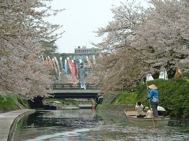 市街地の中心を流れる松川の3.9kmにわたって約530本の桜が咲き乱れ、「さくら名所100選」にも選ばれた。「水と緑のプロムナード」をテーマに28基の彫刻も設置されており、富山市のシンボルとして市民に親しまれている。船で桜のアーチをくぐって優雅に遊覧するのもいい。