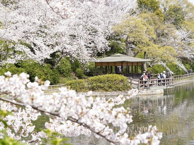 大きな池のある公園を散策しながら桜を観賞