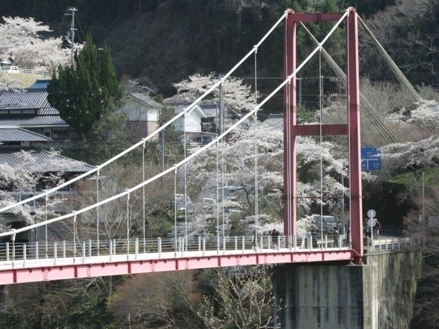 赤い橋と桜のコントラストが美しい