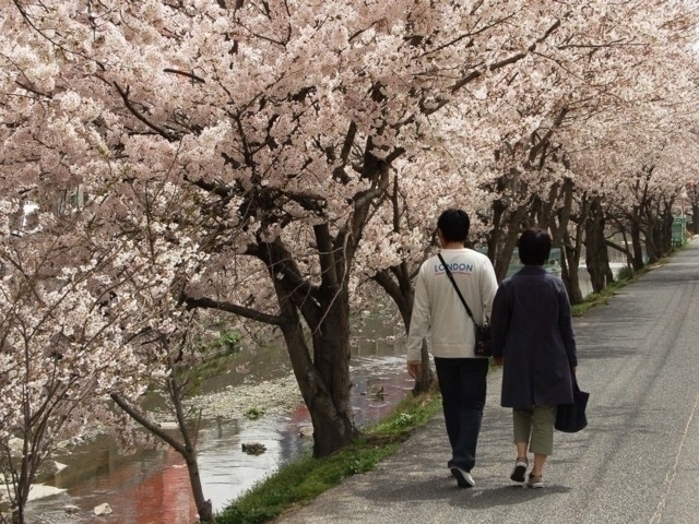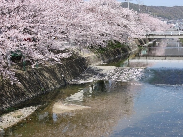 川面に散る桜も見事。地元の人から親しまれる桜土手