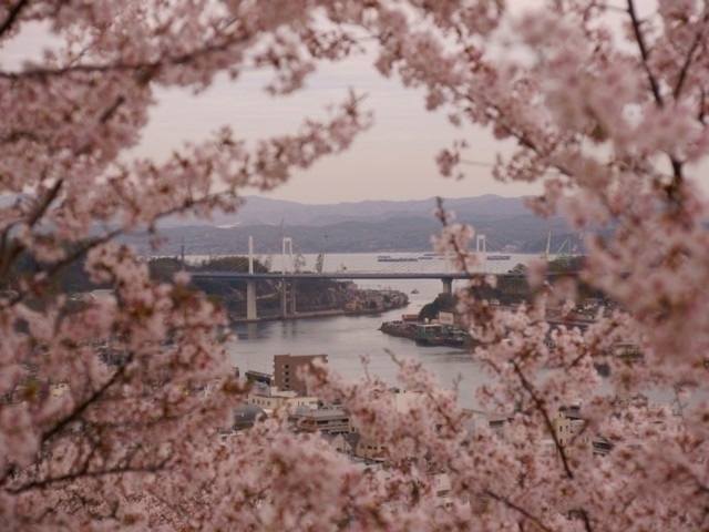 山頂から眼下に広がる瀬戸内の景色と桜のじゅうたん