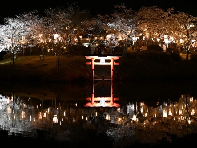 広島県の北東部に位置する庄原市。市の中心部に、周囲約2kmの上野池を囲んだ桜の名所として知られる上野公園がある。池の周囲には約600本のソメイヨシノが植えられており、毎年「庄原・上野公園桜まつり」が開催される。桜の木にはぼんぼりが取り付けられ、照らされる夜桜の美しさは随一だ。