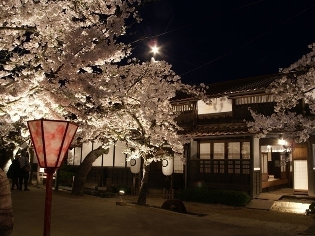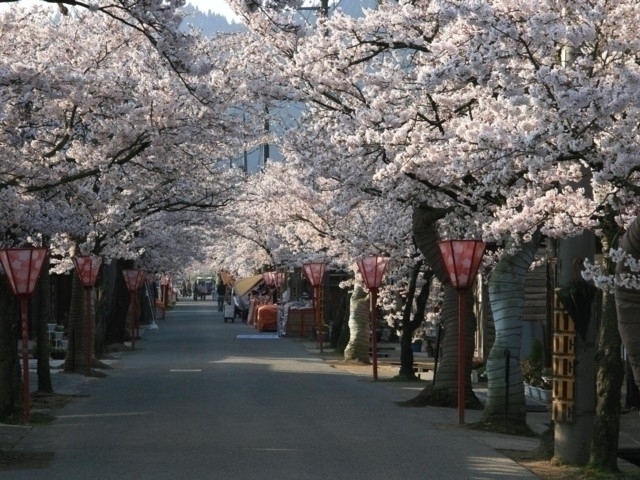 旧出雲街道新庄宿沿いに続く桜並木。日露戦争の戦勝記念に植えられたもので、「がいせん桜」と呼ばれている。本陣跡など風情ある町並みに桜が映えて、見事な景観だ。
