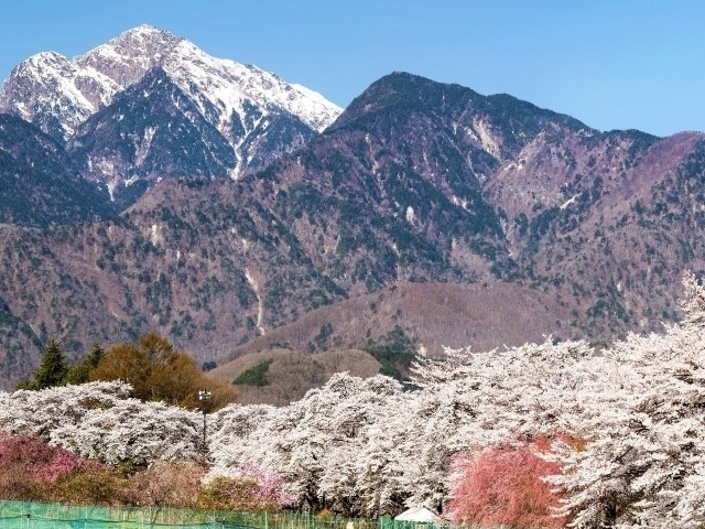 北杜市武川(むかわ)町の眞原(さねはら)地区に広がる牧草地の道路脇に並ぶ約200本ものソメイヨシノの並木。750メートルにわたり桜のトンネルが伸びている。昭和20年代に入植してきた人達が土地の発展を願い、昭和40年代にソメイヨシノを植樹したのが始まり。満開時には甲斐駒ヶ岳など南アルプスの残雪を眺めながら、桜吹雪のなかをゆったりと散策することができ、近くには天然記念物の「山高の神代桜」も見られる。また近隣にはキジが生息し、運が良ければ国鳥に出会うことも。