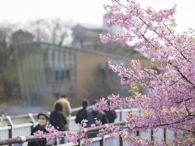 濃いピンクが華やかな早咲きの河津桜が池沿いに咲くと春がやってくる。ライトアップも幻想的。河津桜をメインとしたイベント「二ツ池公園さくらまつり」が開催される。