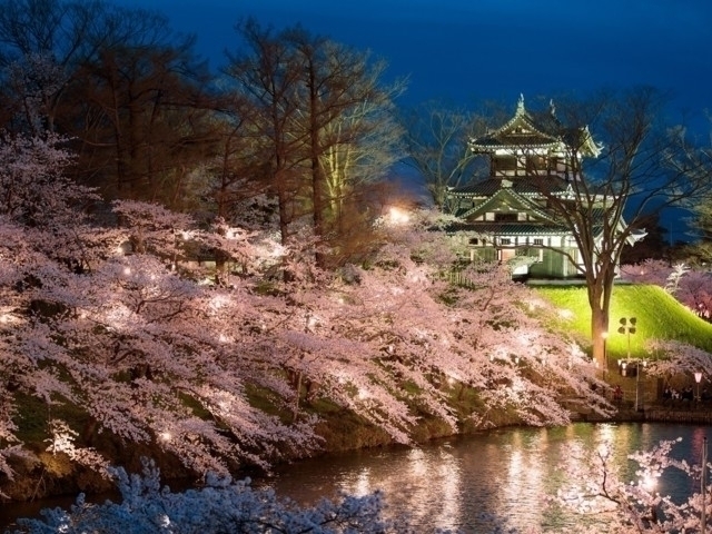 「日本三大夜桜」の一つといわれる公園。約3000個のぼんぼりに照らされた桜に加え、ライトアップされた高田城三重櫓が優美で幻想的な雰囲気を醸し出す。4月3日から4月19日には「高田城址公園観桜会」を開催予定。(ライトアップ・ぼんぼり点灯は変更の場合あり)