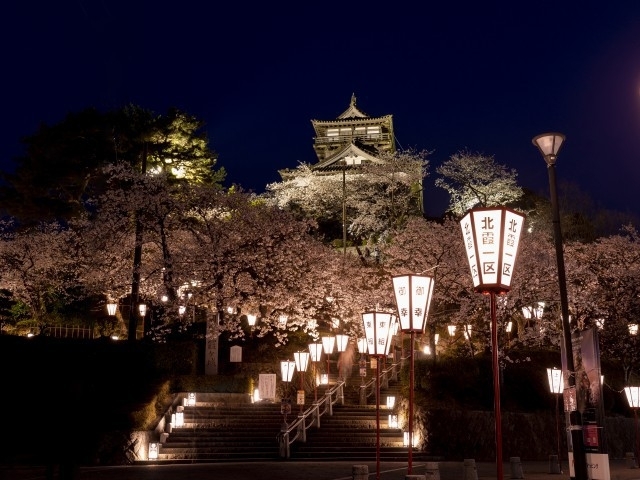 1576(天正4)年築城で「日本100名城」に選ばれている丸岡城は、桜の名所としても有名。「さくら名所100選」にも認定されている。その昔、大蛇が霞を吐いて天守を守ったという言い伝えから「霞ヶ城」と呼ばれるようになり、現在は約400本のソメイヨシノが満開を迎えた時に花霞によって演出される。「丸岡城桜まつり」期間中は約300本のぼんぼりが灯され、夜桜も楽しめる。