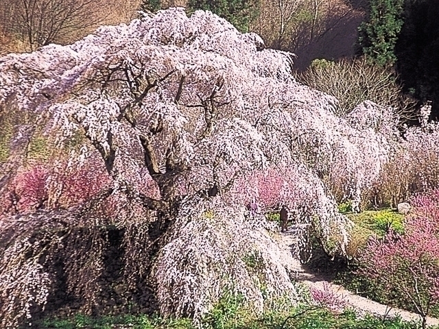 普段は静かな本郷が桜の咲く頃、多くの人でにぎわう。幹周3m、高さ13mで大きく枝を広げたシダレザクラは、樹齢300年ともいわれる見事な桜で、地元では武将・後藤又兵衛の伝説にちなみ「又兵衛桜」とも呼ばれている。