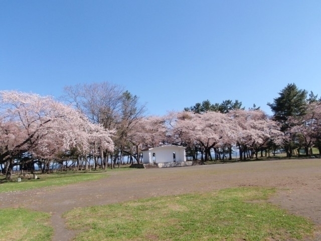 桜の名所として有名な、陸奥湾に面する歴史ある海浜公園。桜並木と松林が織り成す薄桃色と緑のコントラスト、その向こうに青い海が見える珍しい風景が楽しめる。開花期間中は「青森春まつり」も開催され、ぼんぼりが点灯し、にぎわいをみせる。