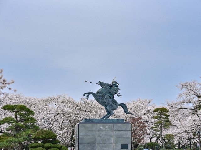 霞城公園は山形城跡を整備した公園。山形城は全国有数の規模を誇る平城で、本丸、二ノ丸と三ノ丸の一部が国の史跡となっている。公園内には約1500本の桜があり、東堀の桜や園内のシダレザクラがライトアップされ、夜桜も楽しむことができる。また、満開の時期にあわせ大茶会など風流なイベントが開催される。