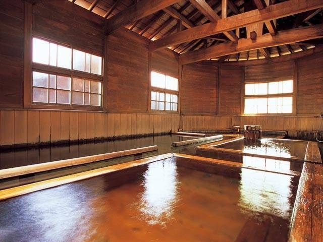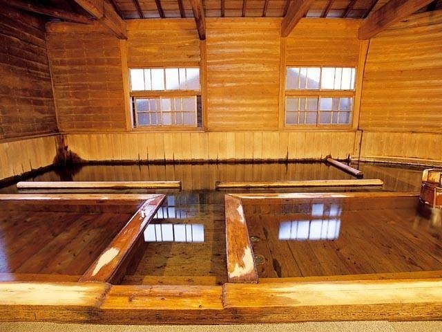 緑あふれる山間に建つ江戸時代創業の老舗旅館。大正4(1915)年に造られた千人風呂は長さ15m、幅5m、最深部1mと国内最大級の規模を誇る巨大な総檜の風呂で、掛け流しの自家源泉を満喫できる。
