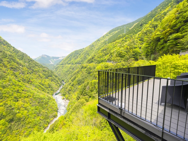 祖谷渓の断崖に建つ一軒宿。ケーブルカーで170mほど下った谷底に四国では珍しい自噴する源泉掛け流しの露天風呂があり、美しい渓谷を見ながら湯に浸ることができる。客室からも渓谷美が眺められる。