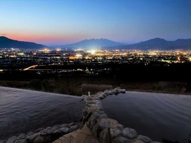 露天風呂から見渡す甲府盆地がとても美しい「みたまの湯」。夜には、また違った美しさの眺めも堪能でき、温泉施設としては全国初、2019年3月に「夜景100選」、9月に「日本夜景遺産」に選ばれた。源泉は茶褐色で、その色は太古の植物から溶け出した天然有機物によるもの。
