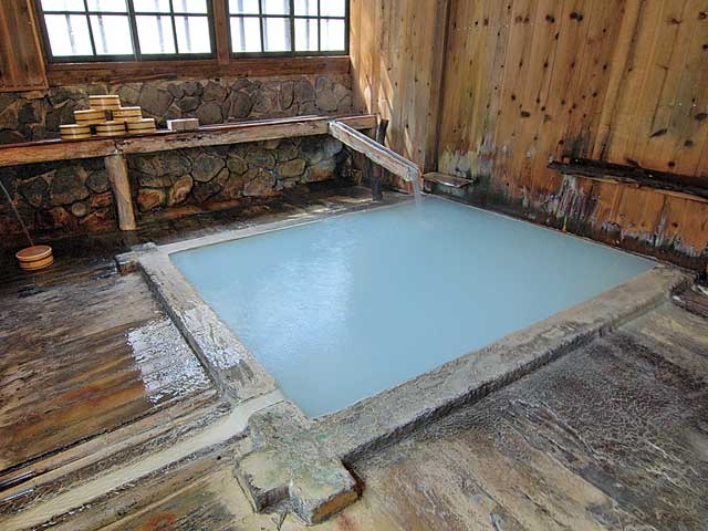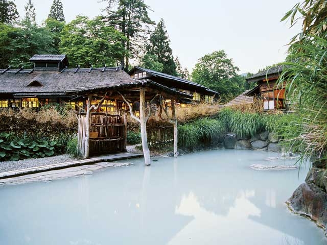乳頭温泉郷の中で最も古い歴史をもち、乳白色の湯はみちのくの秘湯の代表格。秋田藩主・佐竹氏が建てた萱葺き屋根の長屋は現在、宿泊で利用できる。