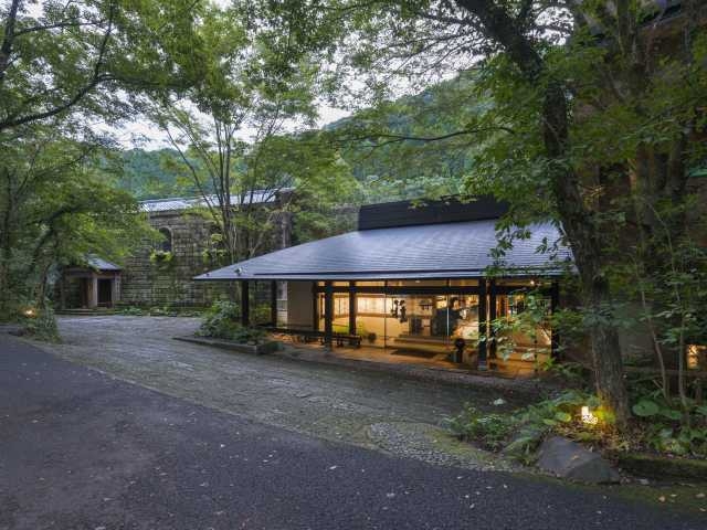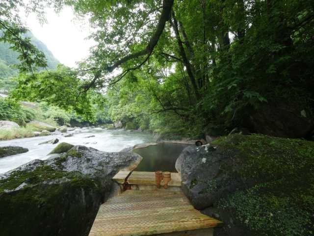 三つの源泉をもち、豊富な湯を誇る温泉宿。天降川の造形美を生かした渓流沿いの男女別露天風呂と大浴場の「天降殿」は、いずれも15:00まで日帰り入浴利用ができる。温泉の後は湯上がりラウンジでゆったりとくつろげる。