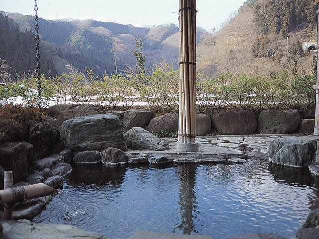 小原温泉郷の玄関口にある温泉宿。周囲の山々を見渡す露天風呂は岩を配した自然な造りで、周囲の景色と一体化しているような心地よさがある。温かいもてなしも好評だ。