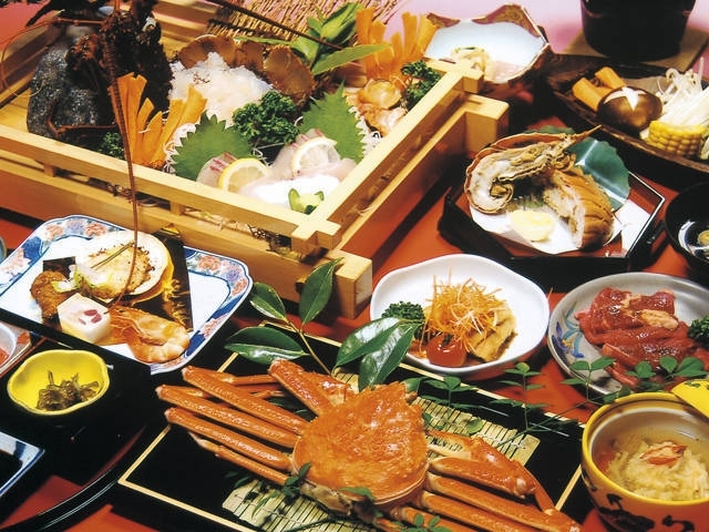 夕日が眺められる展望露天風呂、ステンドグラス張りの内湯「ギヤマン風呂」など個性的な湯がそろい、日帰り入浴利用ができる。