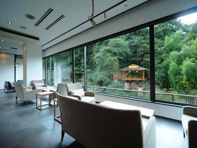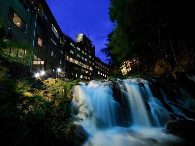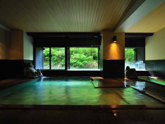 名瀑「伏見ヶ瀧」を眺めながら入る小原庄助ゆかりの湯で、大浴場と露天風呂はまさに絶景風呂。露天風呂は檜を使用し、滝の音とマイナスイオンがよりリラックス効果を増幅する。大浴場は全面ガラス張りで、滝をはじめ渓谷美が満喫できる。
