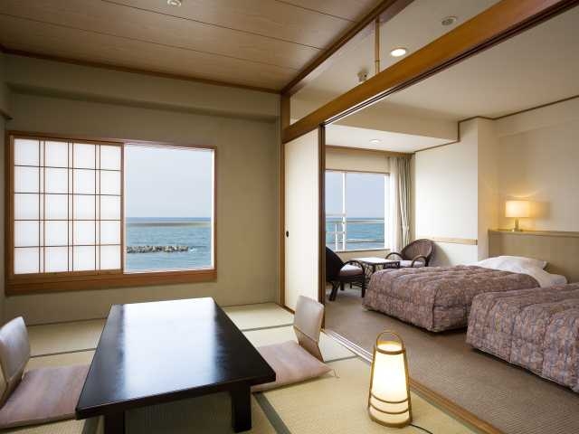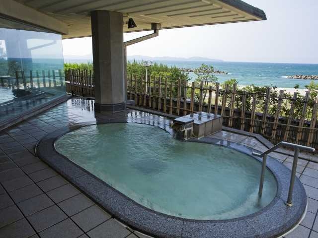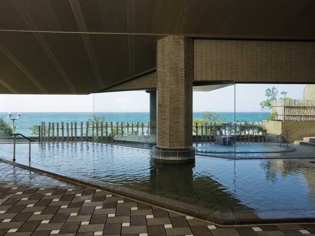 日本海に面して建つホテルからは遥か遠くまで素晴らしい眺望が楽しめる。2階にある大浴場には、独自に掘り出した自家源泉「宝生の泉」の湯が豊かにあふれている。