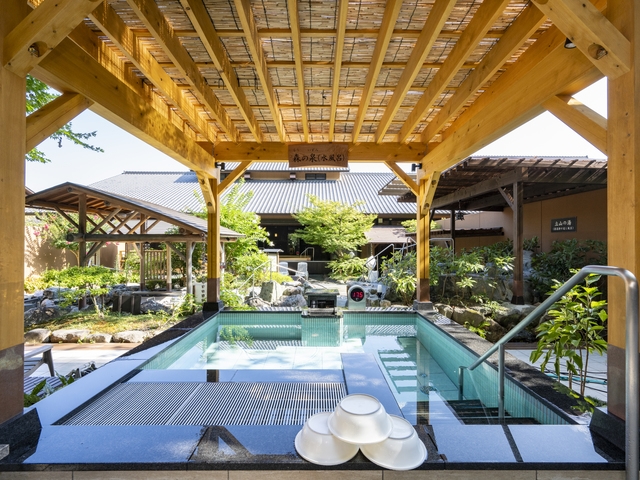 源泉掛け流しの湯船をはじめ、シルク風呂や高濃度炭酸泉、壺風呂など多彩な湯が楽しめる露天風呂が評判。内風呂も開放的な造りで、山肌が切り立つ四季折々の自然を眺めながら湯三昧できる。森のロウリュウサウナ、森の水風呂や深美泡泉の立湯も楽しめる。