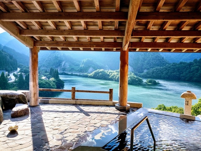 庄川の上流に位置し、抜群のロケーションを誇る新五箇山温泉の温泉館。広々とした大浴場や情緒たっぷりの露天風呂からは、五箇山の深い渓谷と清流が織り成す幽玄な自然美を一望できる。