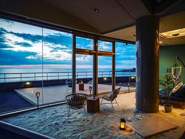 真っ赤な夕日を浴びる「かもめの湯」と日本海に注ぐ九頭竜川を望む「みなとの湯」が月ごとに男女交替。いずれもロケーションは素晴らしく、絶景と温泉を同時に楽しめる趣向だ。2階の海テラスは食事や休憩ができる。