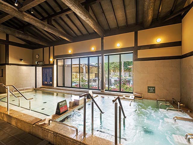 地下1620mより湧出したナトリウム-塩化物泉の温泉は、弱アルカリ性で肌を優しく包む。ひのき林に囲まれた露天風呂は、森林浴気分が心地よい。内湯には、医療業界でも注目を集める高濃度炭酸泉を再現。体内に取り込まれた炭酸ガスが全身の血管を拡張し、血液の循環をよくする。ほかに電気風呂やジェットバスなど多彩に揃う。