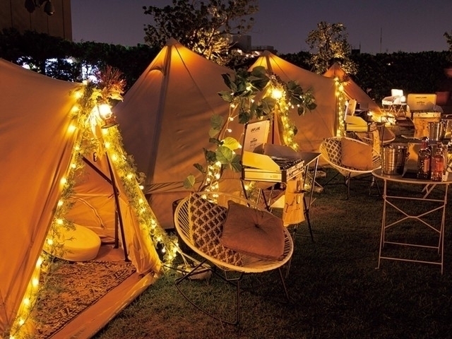 東京スカイツリータウン(R)にある都市型グランピング施設。BBQ機材付きのグランピングテントが設営されたエリアで、気軽にグランピングBBQが満喫できる。ウエストヤード2Fフードマルシェで購入した食材の持ち込みができるほか、料理と飲み物込みの様々な手ぶらプランも用意されている。