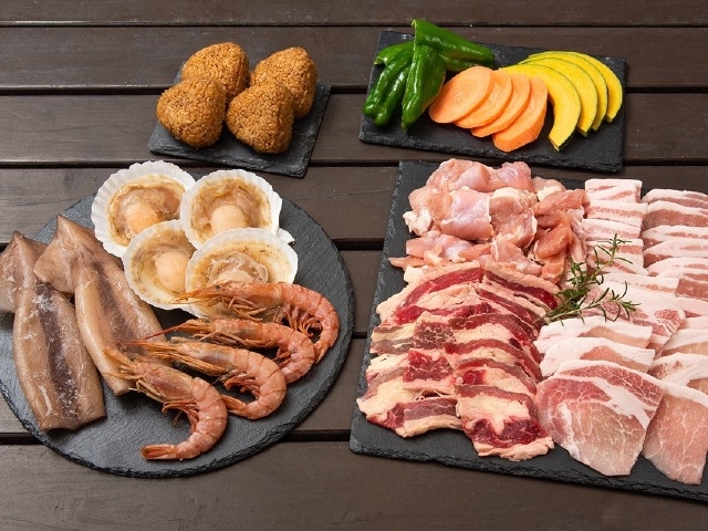 - お手軽BBQセット(4人前)7700円、海鮮BBQセット(4人前)8800円、肉盛りセット(4人前)4600円、贅沢セット(2人前)5000円、窯で焼く本格手作りピザ(2~3人前)1800円ほか