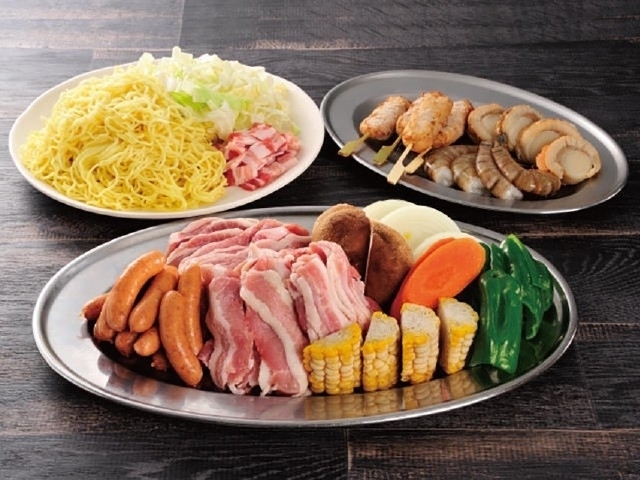 - BBQ食材セット(2人前から要予約)1人前2200円~、BBQセット(炭1kg・ライター・着火剤・トング・火ばさみ・皿・割り箸・軍手・タレ・油等)700円
