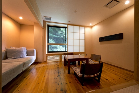 板室温泉の静かな環境の中に、町屋をイメージした外観と空間が広がる。個性的な8室の客室はすべて趣が異なる造りで、源泉掛け流しの温泉に入れるビューバス付きのお部屋や書斎付きのお部屋など、趣向をこらしている。自慢の自家源泉の温泉は、加水加温なしの100%源泉掛け流し。PH9.7のアルカリ性単純泉は、美肌効果抜群で女性からの人気も高い。極上の湯を立ち湯のある大浴場や開放感いっぱいの露天風呂で愉しむことができる。夕食は地元で採れた食材をメインとし、体に優しいメニューを和のコース料理でにて、地元のお酒とともに一緒に味わうことができる。女性用アメニティは自然派化粧品を用意。温泉水を使用して作った手作り石けんも好評だ。