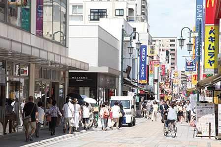 個性的な商店から大型複合店まで、約1kmにわたって続く商店街。