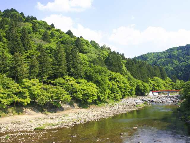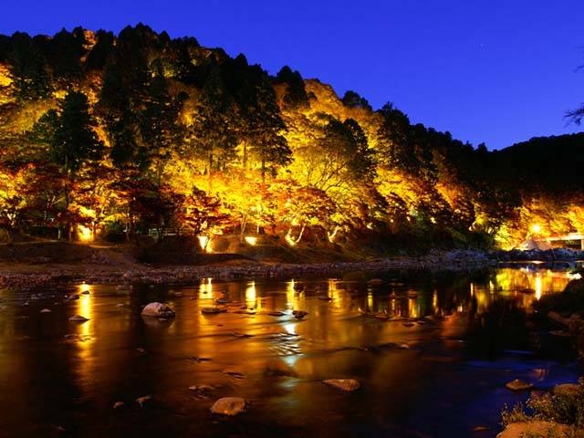 山々に囲まれた香嵐渓では、四季折々の自然美を楽しむことができる。なかでも、巴川沿いから香積寺にかけて約1kmにわたり、4000本ものモミジが紅葉する秋の風景は圧巻。