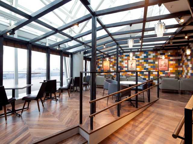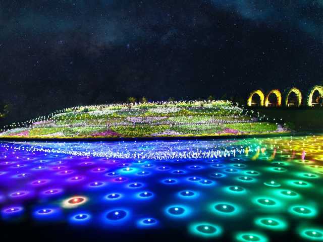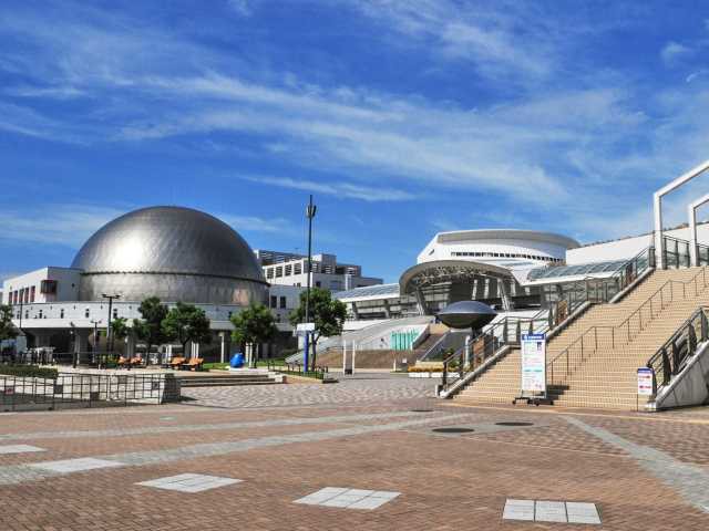空中に浮かぶガラスの大屋根「水の宇宙船」がシンボル。夜にはライトアップも行われ、フォトジェニックスポットとして人気。芝生が広がる「緑の大地」やイベントスペース「銀河の広場」のほか、約30のショップが集まる。