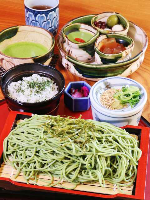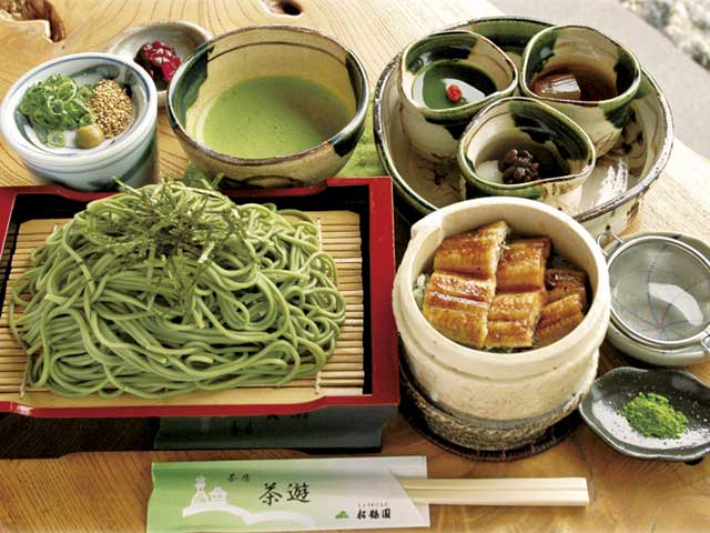 - 茶遊御膳=1706円/抹茶そば=1080円(200g×2袋)/平日20食限定ランチ=980円~/抹茶パフェ=734円/甘味メニュー=450円~/雅の司=2160円(30g入)/