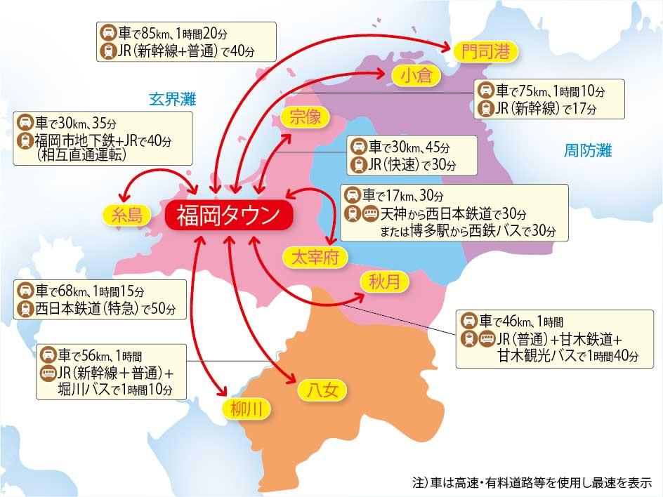 いざ旅の計画を立てるとなると、どの交通手段がよいのか、エリアの位置や人気スポットがどこにあるのか案外わからないもの。まずは、この福岡観光地図でさくっと把握してみよう!