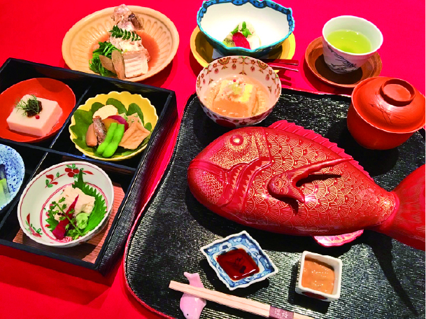 - 鯛ごはん懐石膳さくら(昼)=3024円/鯛ごはん松花堂(昼)=3780円/鯛茶漬け松花堂(昼)=4104円/鯛ごはん懐石(夜)=4860円~/鯛茶漬け懐石(夜)=5184円~/