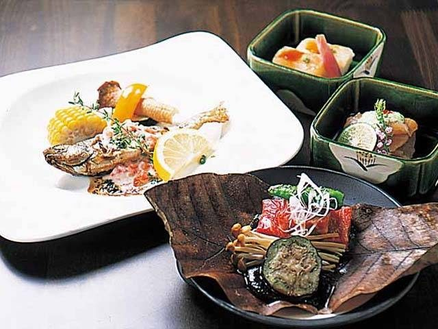 信州和牛、信州サーモン、伝統野菜など地のもののおいしさを存分に生かした繊細な料理が味わえる。イワナやニジマスなどの川魚をはじめ、春や秋は山菜やキノコ、夏には旬の野菜など、四季折々の食材を堪能できる。