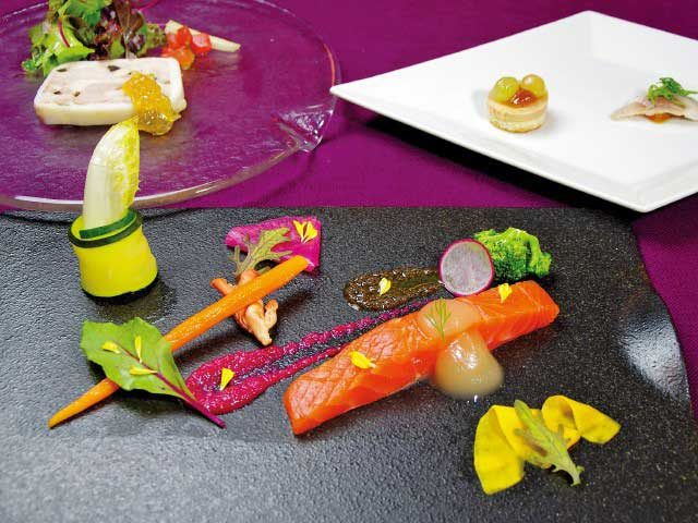 松本市内の自社農園で採れた野菜をはじめ、山海の幸をアート作品のような一皿に昇華させている。