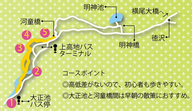 大正池バス停で下車して河童橋へ向かうのがおすすめ。