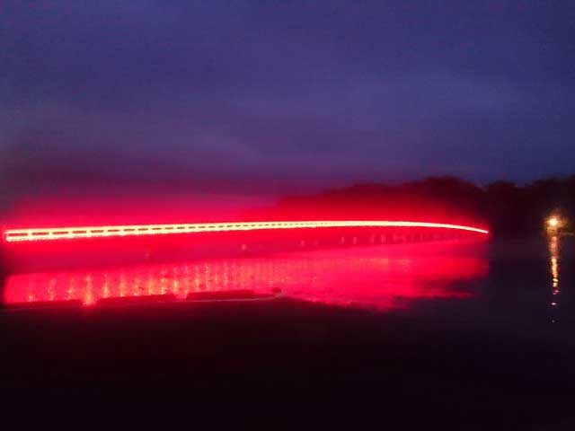 足元から海が見える朱塗りの透かし橋で五大堂へ