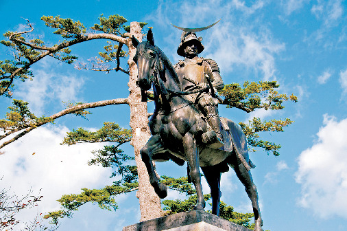 約270年にわたる伊達家の居城跡。仙台市街を望む天守台には伊達政宗の騎馬像が立つ。
