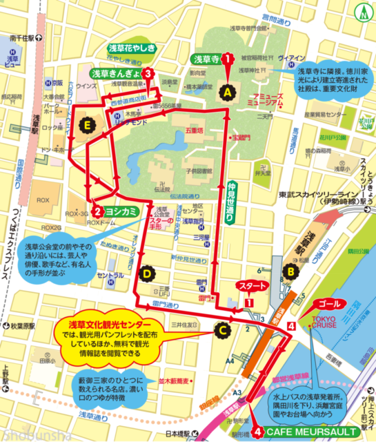 黒丸のA:浅草寺、B:EKIMISE、C:浅草文化観光センター、D:レトロサンプル(喫茶店や食堂の店頭にある、昔ながらのメニューサンプルも探してみよう)、E:まるごとにっぽん